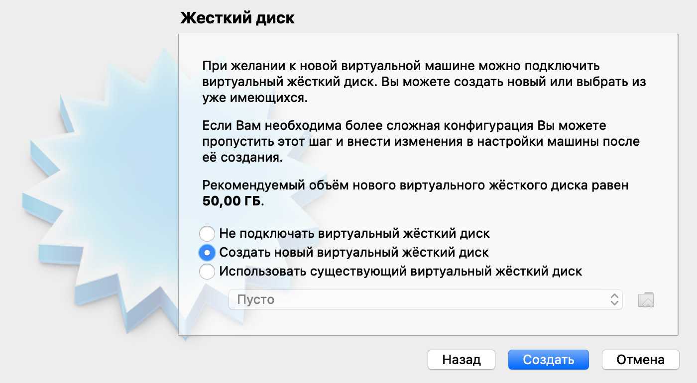 Далее указываем размер жесткого диска (советую по умолчанию оставить 50 Гб). После выбора нажимаем “Создать”: