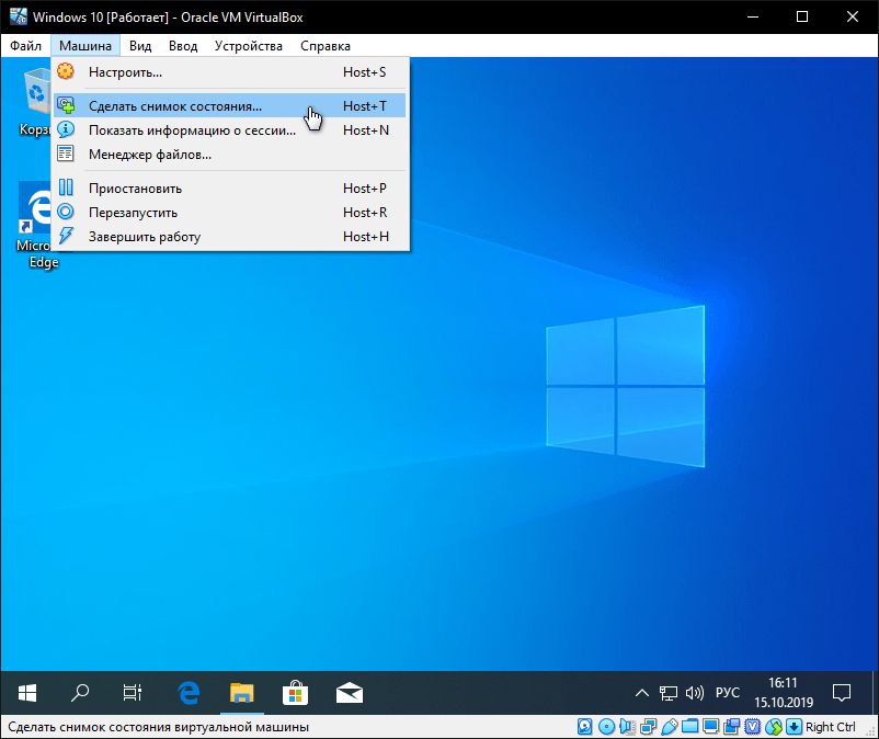 Раскройте верхнее меню «Машина» и нажмите «Сделать снимок состояния«