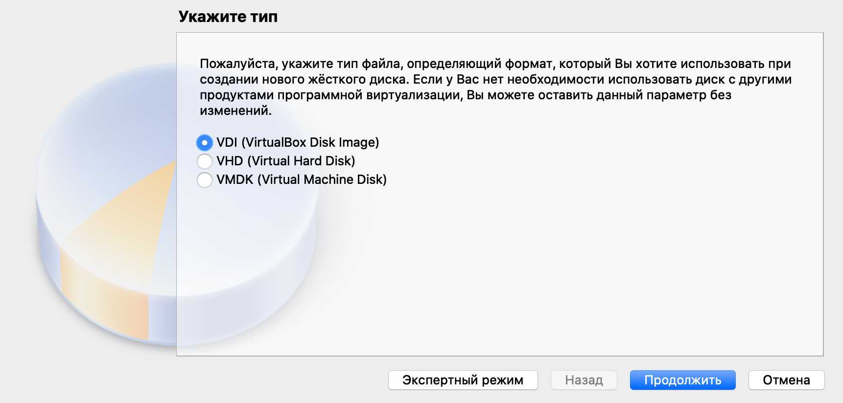 Выберите VDI (VirtualBox Disk Image) и продолжайте дальше.