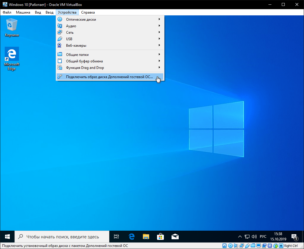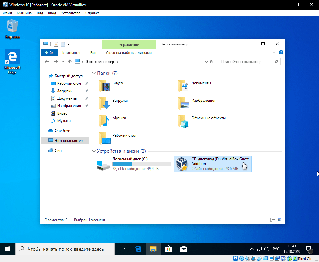 Зайдите в Проводник > Этот компьютер и установите «VirtualBox Guest Additions«.