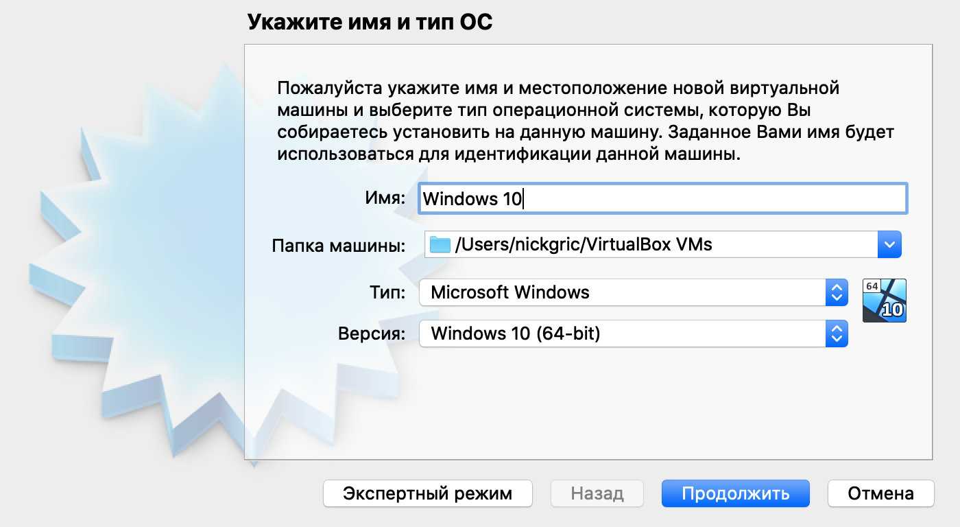 Называем нашу операционную систему в поле «Имя». В поле «Тип» выбираем ОС Microsoft Windows. В поле «Версия» выбираем версию ОС. Я выбрал 64 bit версию. Вы выбирайте ту версию которую вы скачали. (32 бит или 64 бит) После настройки нажимаем “Продолжить”: