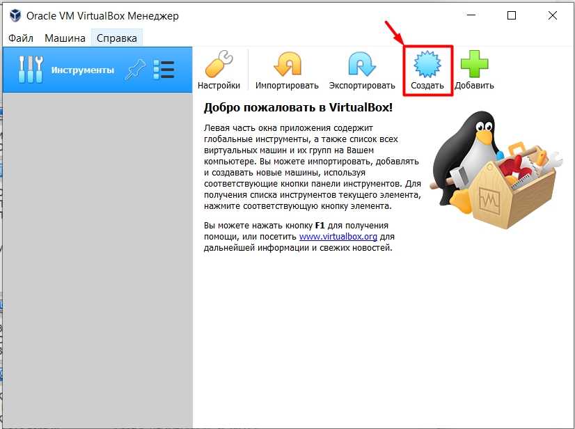 Первое что нужно сделать, это «Скачать образ Windows 10 с официального сайта Microsoft» на компьютер. Поле чего, открыть программу VirtualBox и нажать кнопку «Создать«.