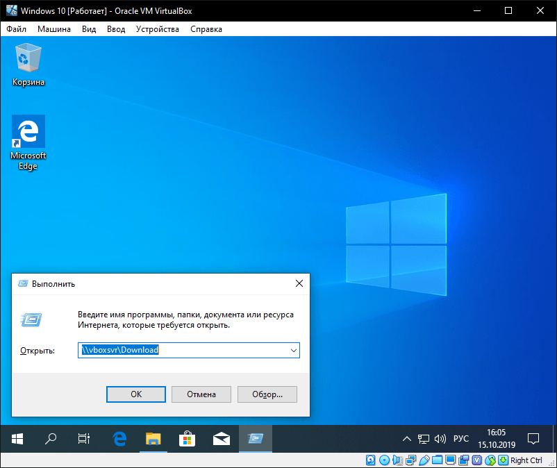 Для обмена файлами с виртуальной машиной необходимо открыть общую папку, для этого запустите окно команды «Выполнить» сочетанием клавиш Windows + R, введите \vboxsvrDownload где «Download» впишите имя вашей общей папки указанной в настройках, нажмите «Enter» или кнопку «OK«.