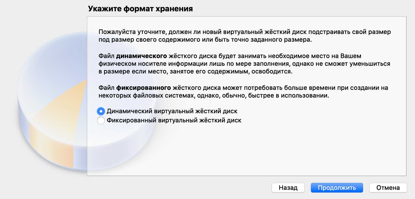 В следующем окне выбираем формат хранения (по умолчанию оставляем «Динамический виртуальный жесткий диск»).