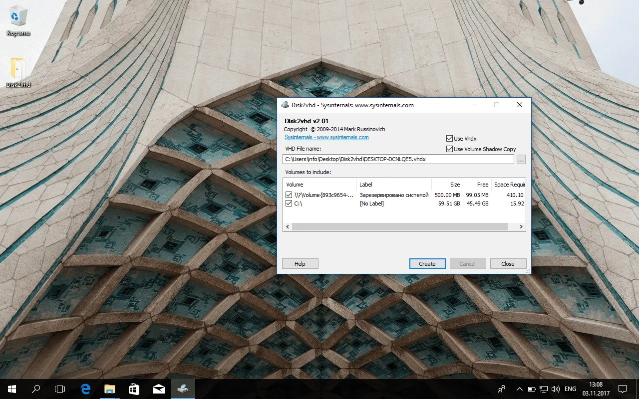 Disk2VHD обрабатывает выбранные тома и превращает их в образы виртуальных дисков, которые сохраняются в выбранном месте.