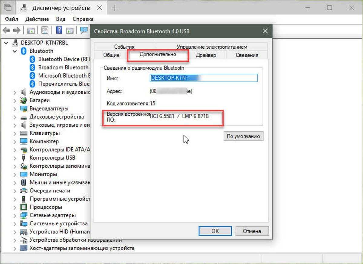 Перейдите на вкладку «Дополнительно» и посмотрите информацию в поле «Версия встроенного ПО». Сравните значения с таблицей ниже, чтобы определить версию Bluetooth, установленного в компьютере.