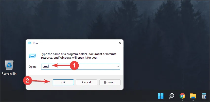 - Нажмите Ключ Windows + р и введите cmd. Нажмите Входить или щелкните Ok.