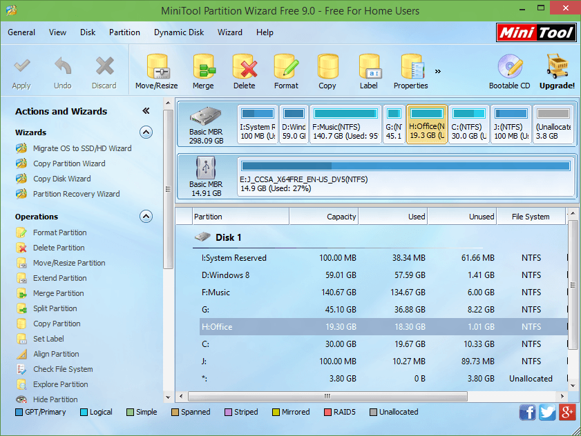 Чтобы разбить диск на разделы, также можно использовать программу MiniTool Partition Wizard.
