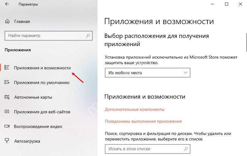 Через меню слева переходим к разделу «Приложения и возможности» ;