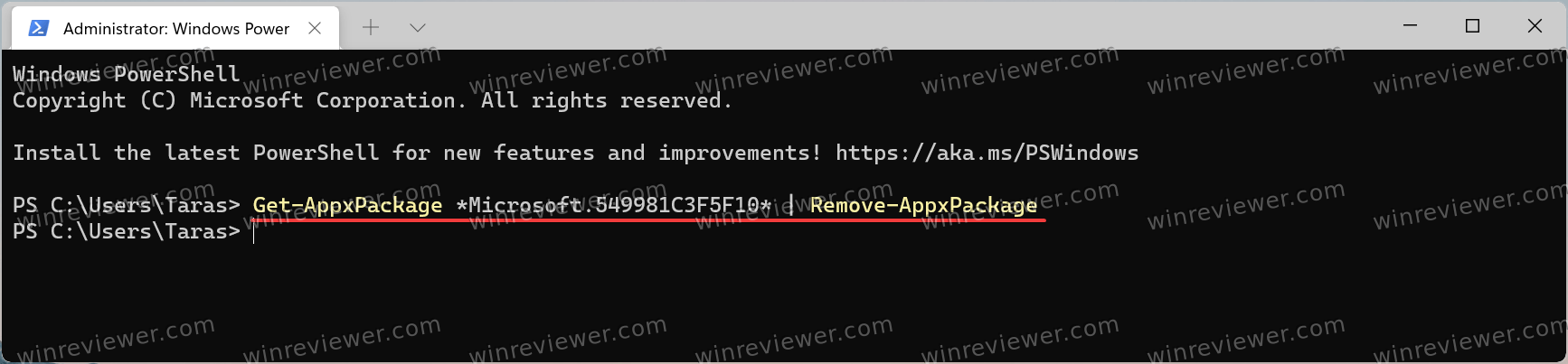- Введите следующую команду: Get-AppxPackage *Microsoft.549981C3F5F10* | Remove-AppxPackage и нажмите Enter .