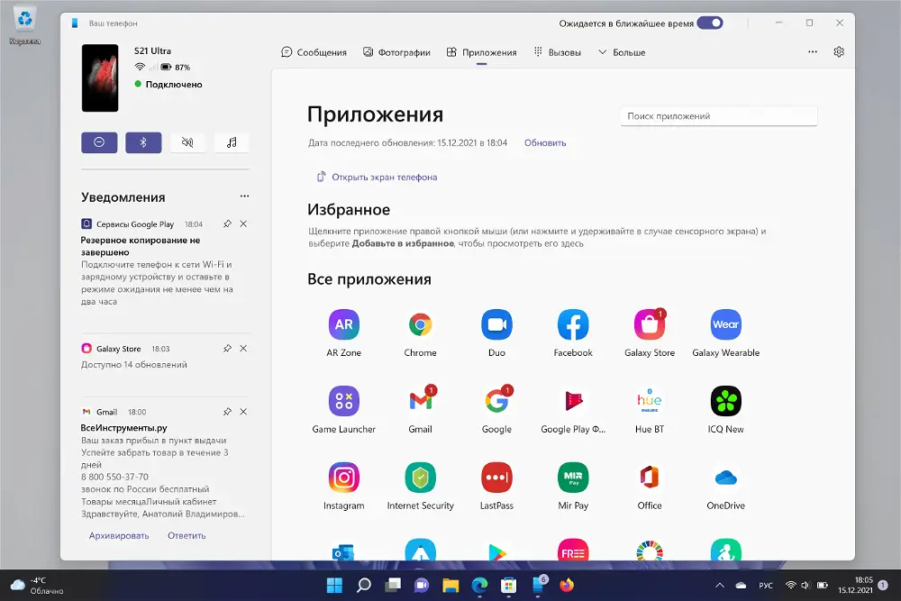 Предустановленное приложение «Ваш телефон» позволяет связать смартфоны Android с Windows 11. Для использования этой функциональности вы должны установить на свой смартфон Android приложение-компаньон «Диспетчер вашего телефона» или использовать «Связь с Windows» для Samsung, а затем войти в один и тот же аккаунт Microsoft на смартфоне и на компьютере, чтобы заработала синхронизация.
