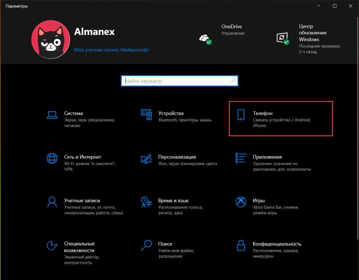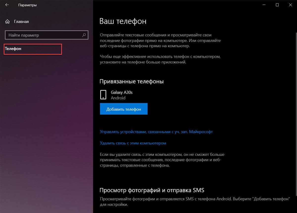 В параметрах Windows 10 перейдите в раздел «Телефон».