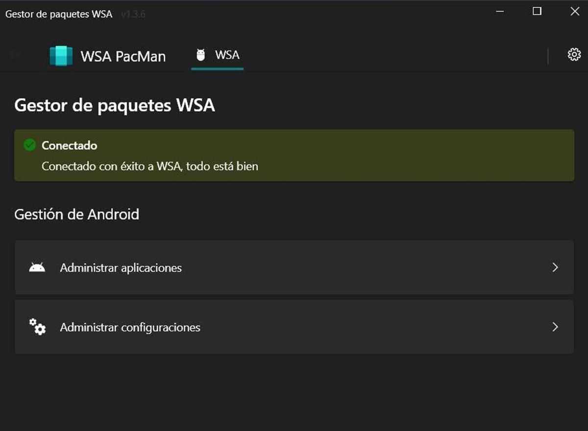 Установите ранее загруженную программу WSA PacMan и откройте его. Если вы до сих пор все сделали правильно, то должны увидеть в программе такое сообщение: «Успешно подключено к WSA, все в порядке».
