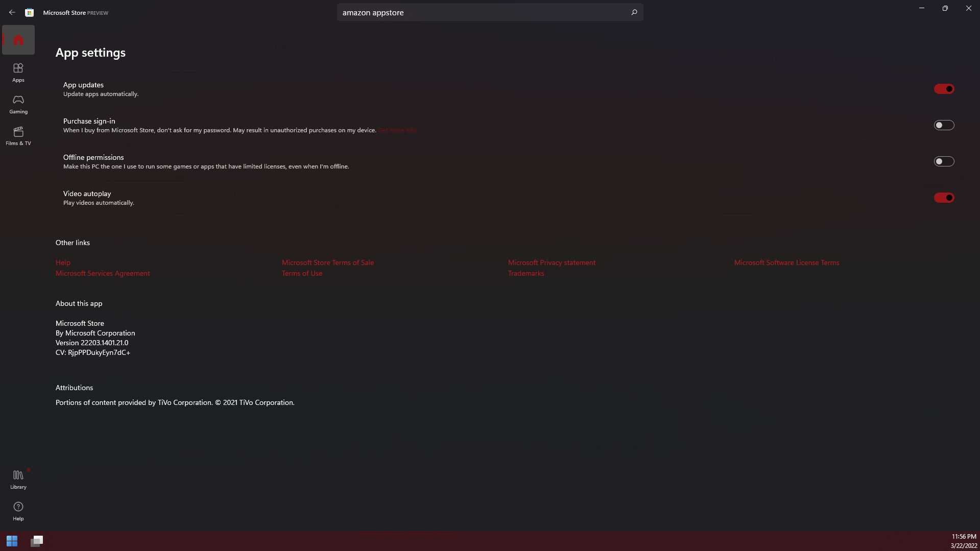 Убедитесь, что вы используете Microsoft Store версии 22110.1402.6.0 или выше. Проверьте, так ли это, перейдя в настройки приложения Microsoft Store, где вы увидите номер версии, указанный внизу. Если она ниже, чем указанная выше версия, перейдите в раздел «Библиотека» > «Получить обновления», чтобы запустить обновление для Microsoft Store.