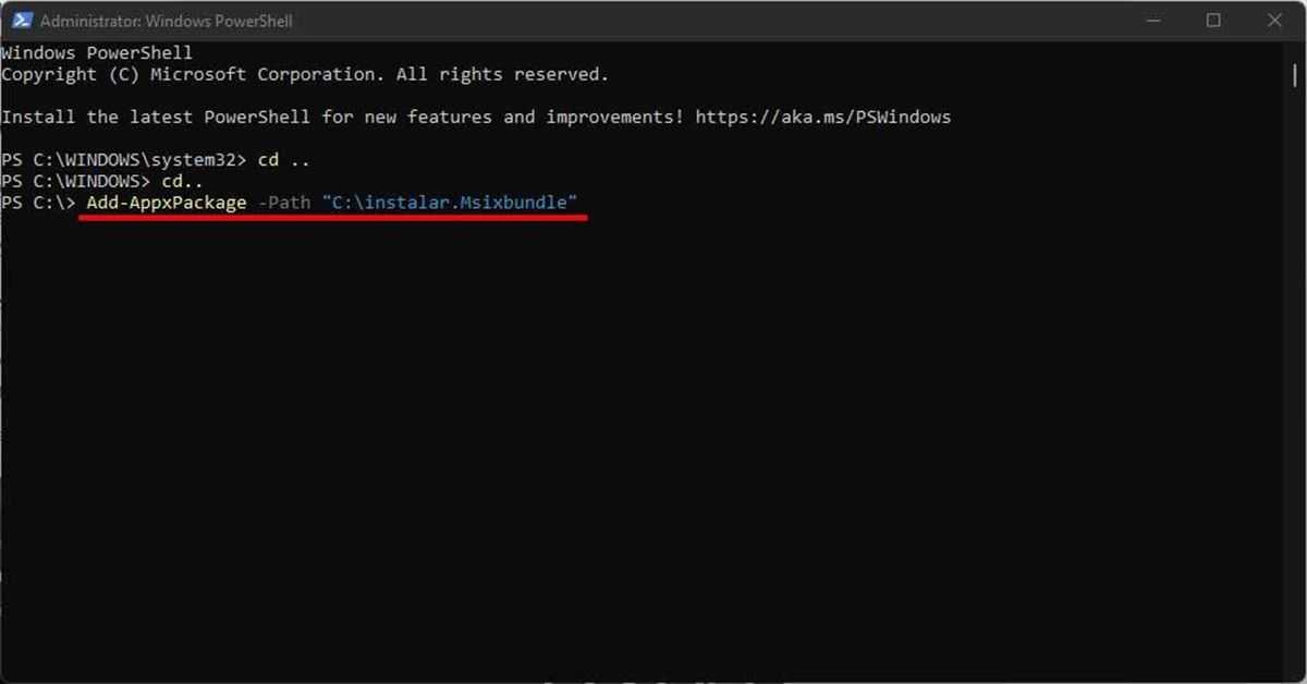 Add-AppxPackage -Path "C:/install.Msixbundle"