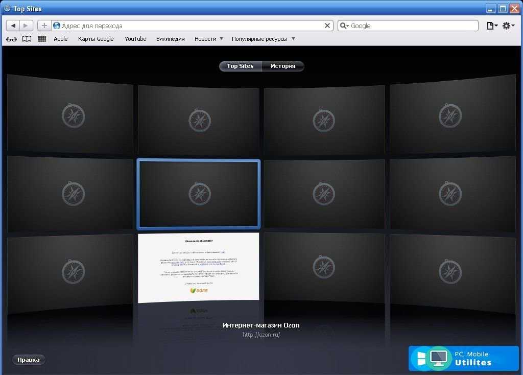 «Top Sites» – это оригинальная разработка Apple. Представляет собой виртуальную имитацию 3D панели, на которую можно добавить до 20 любимых сайтов.