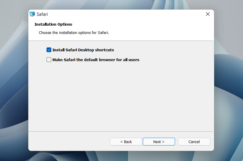 5. Укажите, хотите ли вы добавить Safari в качестве ярлыка на рабочий стол или нет. Кроме того, решите, предпочитаете ли вы его в качестве браузера по умолчанию на вашем компьютере (мы рекомендуем вам не выбирать этот параметр). Выберите Далее, чтобы продолжить.