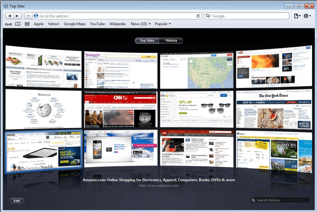 Несмотря на то, что ему почти десять лет, Safari для Windows не выглядит слишком неуместным. Вверху у вас есть знакомая строка URL-адреса (однако вы не можете использовать ее для выполнения поиска), полоса закладок внизу и специальная панель поиска в левом углу. По умолчанию новые вкладки отображают часто посещаемые сайты в формате эскизов — вы можете использовать вкладки «Лучшие сайты» и «История», чтобы переключать их и историю посещенных страниц.