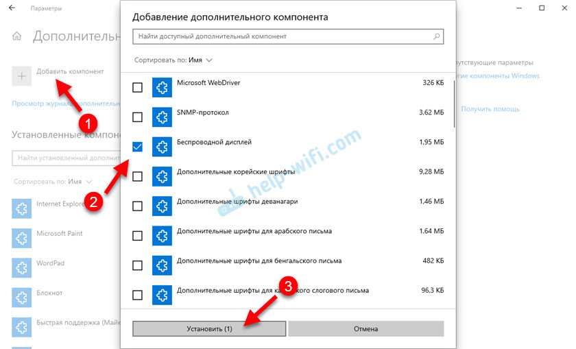 Решение – установить компонент «Беспроводной дисплей». Нажмите на «Дополнительные компоненты» (выделен голубым цветом, смотрите скриншот выше). Затем нажмите на «Добавить компонент», поставьте галочку возле «Беспроводной дисплей» и нажмите на кнопку «Установить».