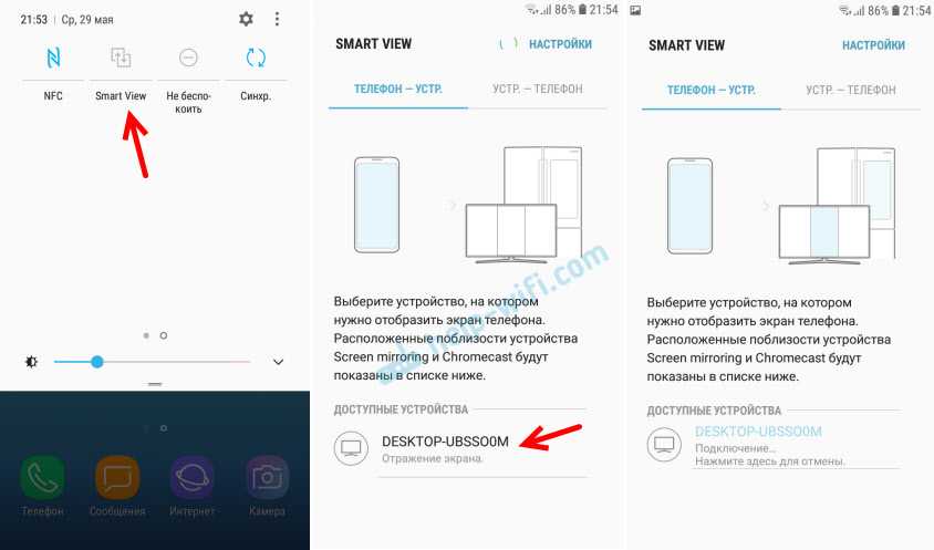 На телефоне нужно открыть статус бар и найти там иконку запуска трансляции экрана по технологии Miracast. На моем телефоне Samsung это Smart View (находится на втором экране, свайп влево). Возможно на вашем устройстве эта функция находится в настройках, где-то в разделе «Подключения», или «Экран».