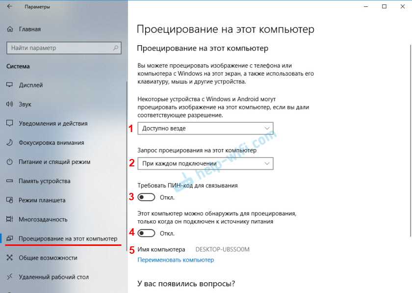 В параметрах Windows 10, в разделе «Система» есть вкладка «Проецирование на этот компьютер». Открываем ее и смотрим настройки: