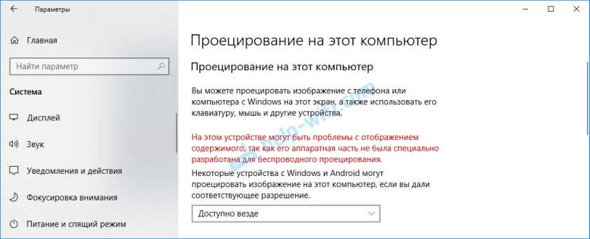 Если у вас не получилось настроить проецирование на беспроводной монитор в Windows 10 с первого раза – попробуйте еще раз. Если в настройках отображается предупреждение о том, что на вашем устройстве могут быть проблемы с отображением содержимого из-за его аппаратной части (писал об этом в начале статьи, там же есть скриншоты), то будьте готовы к тому, что функция «Проецирование на этот компьютер» вообще не будет работать. Или будет работать не со всеми устройствами.
