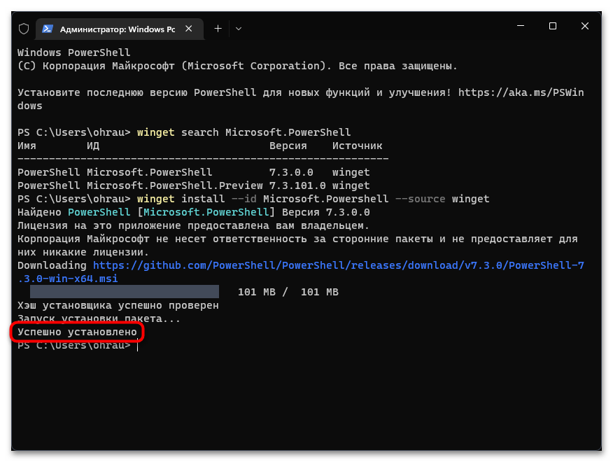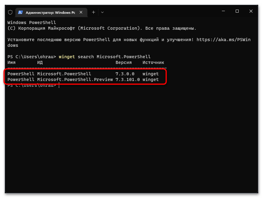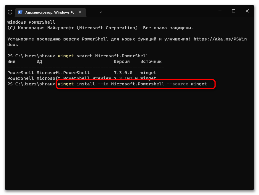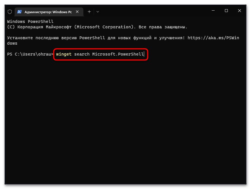 В Windows 11 есть утилита WinGet, которая предназначена для обновления стандартных приложений от Майкрософт. Для того, чтобы обновить Power Shell через WinGet, стоит запустить имеющеюся консоль с правами Администратора и ввести по очереди такие команды: