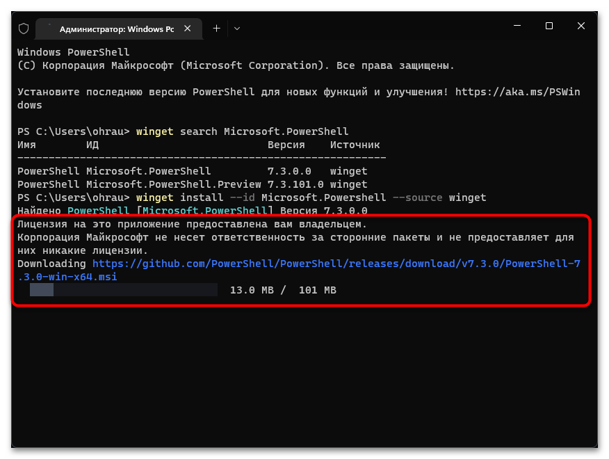 Нажмите клавишу Enter, и PowerShell запустит команду и начнёт загрузку.