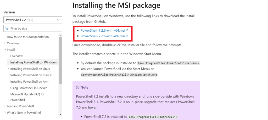 To install PowerShell on Windows, use the following links to download the install package from