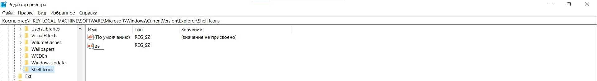 - В разделе Shell Icons щелкните правой кнопкой мыши по пустому месту в правой части окна, чтобы создать строковое значение и назвать его числом«29». Если в существующем разделе уже есть данный файл, нужно пропустить этот пункт.
