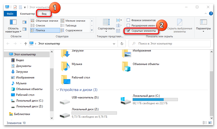 - Откройте системный «Проводник». Кеш ярлыков располагается в скрытой системной папке, и чтобы отобразить такие файлы и каталоги, нажмите на вкладку «Вид» на верхней панели, затем отметьте пункт «Скрытые элементы».