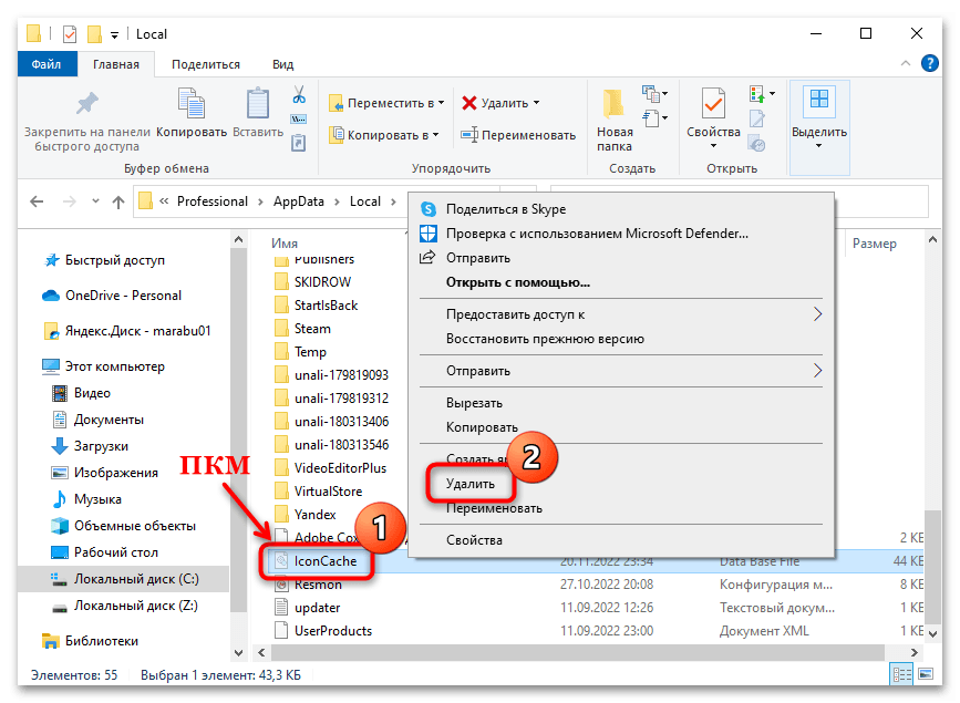 Пролистайте список папок вниз и отыщите файл «IconCache.db». Удалите его любым удобным способом, например через контекстное меню или с помощью клавиши «Delete».