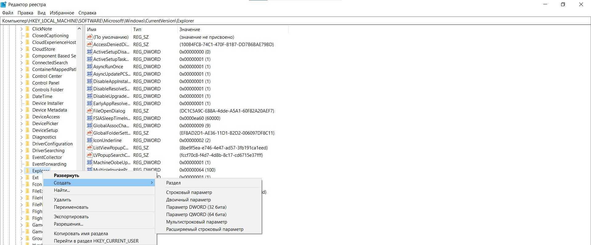 - Найдите папку Explorer, щелкните по ней правой кнопкой мыши, выберите из появившегося меню пункт «Создать» – «Раздел». Назовите его Shell Icons и кликните Enter. Возможно, в папке Explorer у вас уже будет раздел Shell Icons. В этом случае этот пункт нужно пропустить.
