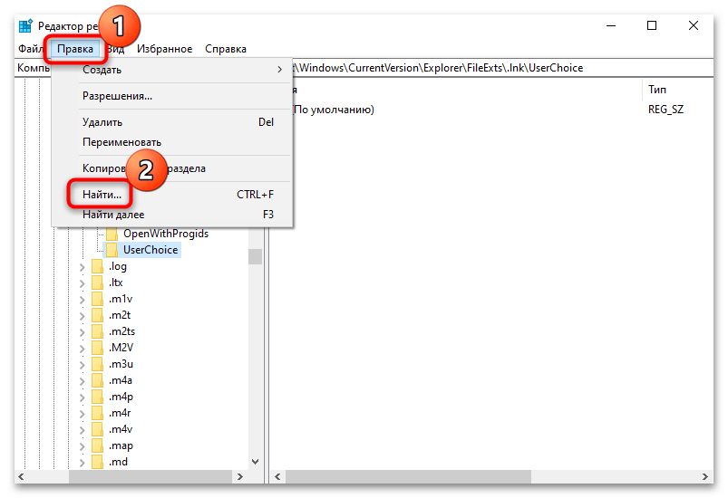 - Откройте «Редактор реестра» так же, как и в Способе 2. Для начала нужно отыскать разделы с ключами, которые подлежат экспорту. Чтобы это сделать, кликните по вкладке «Правка» и выберите пункт «Найти».