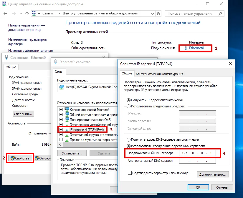 В нашем случае необходимо настроить DNS на 127.0.0.1 (указанное значение для параметра listen_addresses в конфигурационном файле) в параметрах протокола TCP/IP. Как это сделать для Windows рассказывается в статье настройка DNS на компьютере с ОС Windows. Приведем скриншот настройки для нашего случая: