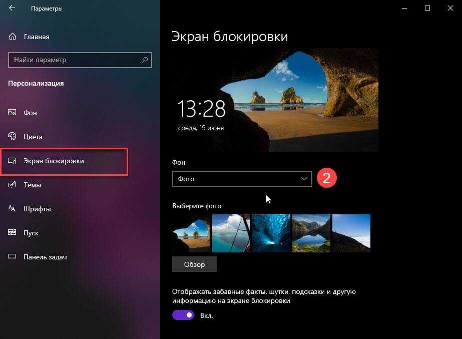 Выберите подпункт «Экран блокировки». Здесь вы можете выбрать одну из предложенных фотографий или загрузить свою из памяти компьютера, кликнув по кнопке «Обзор».