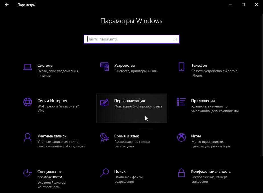 Сначала откройте приложение «Параметры», кликнув значок шестеренки в «Центре действий и уведомлений» в правом нижнем углу экрана или нажмите сочетание клавиш Win + I на клавиатуре. В приложении «Параметры» перейдите в раздел «Персонализация».
