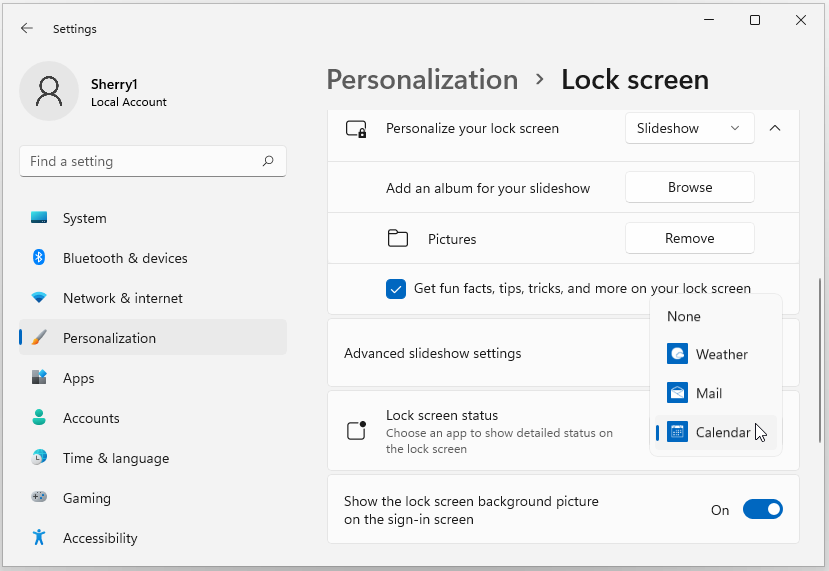 - В параметре «Персонализируйте свой экран блокировки» в раскрывающемся списке выберите «Слайд-шоу».