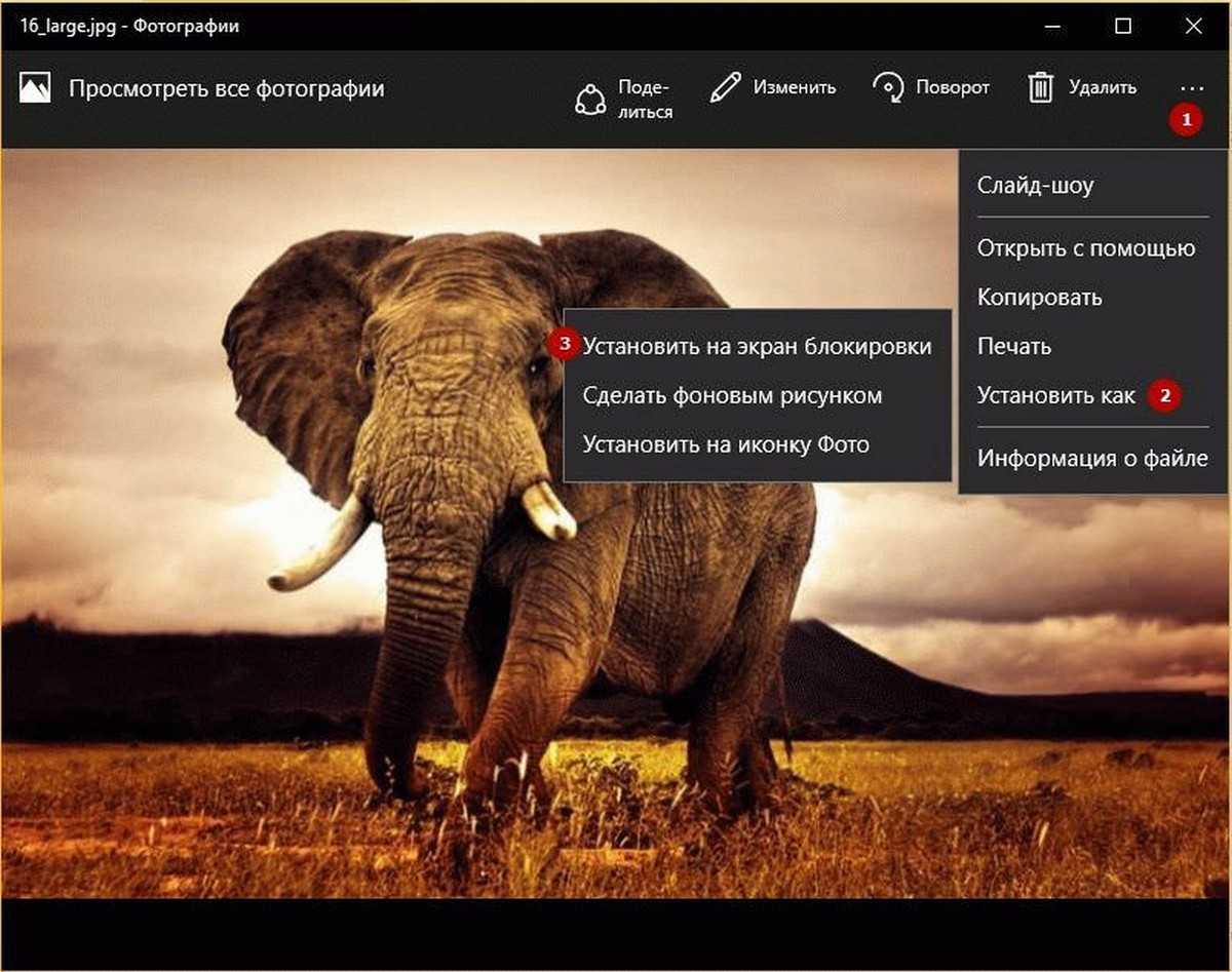 Совет: Вы можете также использовать приложение Фотографии, для установки ваших любимых изображений в качестве фона экрана блокировки. Откройте нужное изображение в приложении Фотографии и нажмите кнопку меню три точки.