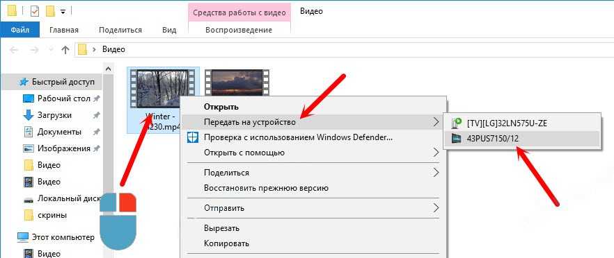 Если ТВ и ПК объединены одной домашней сетью, Windows 10 позволяет без лишних настроек передавать контент напрямую на устройство. Достаточно щелкнуть по файлу правой кнопкой мыши и выбрать нужный девайс из списка во вкладке «Передать на устройство» («Cast to device»).
