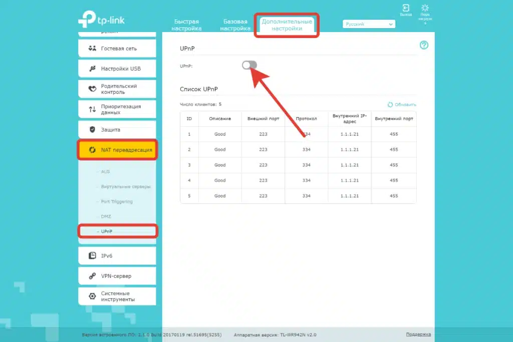 Настройка UPnP на роутере TP-Link находится во вкладке «Дополнительные настройки» в разделе меню «NAT переадресация». Для включения переводим «тумблер» в активное положение