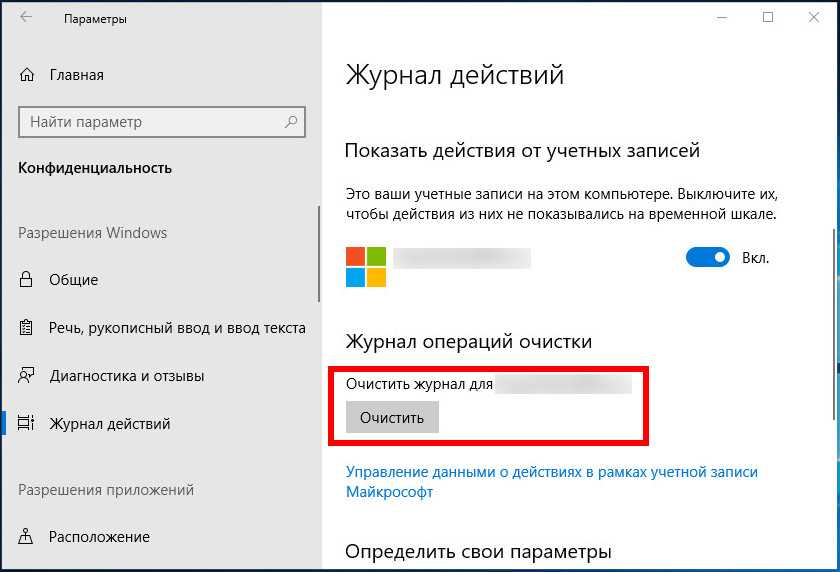 Чтобы удалить содержимое временной шкалы, установите для всех учетных записей Microsoft, которые отображаются в разделе «Показать действия из учетных записей» значение «Выкл.», а затем нажмите кнопку «Очистить».