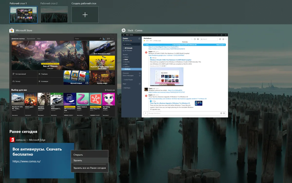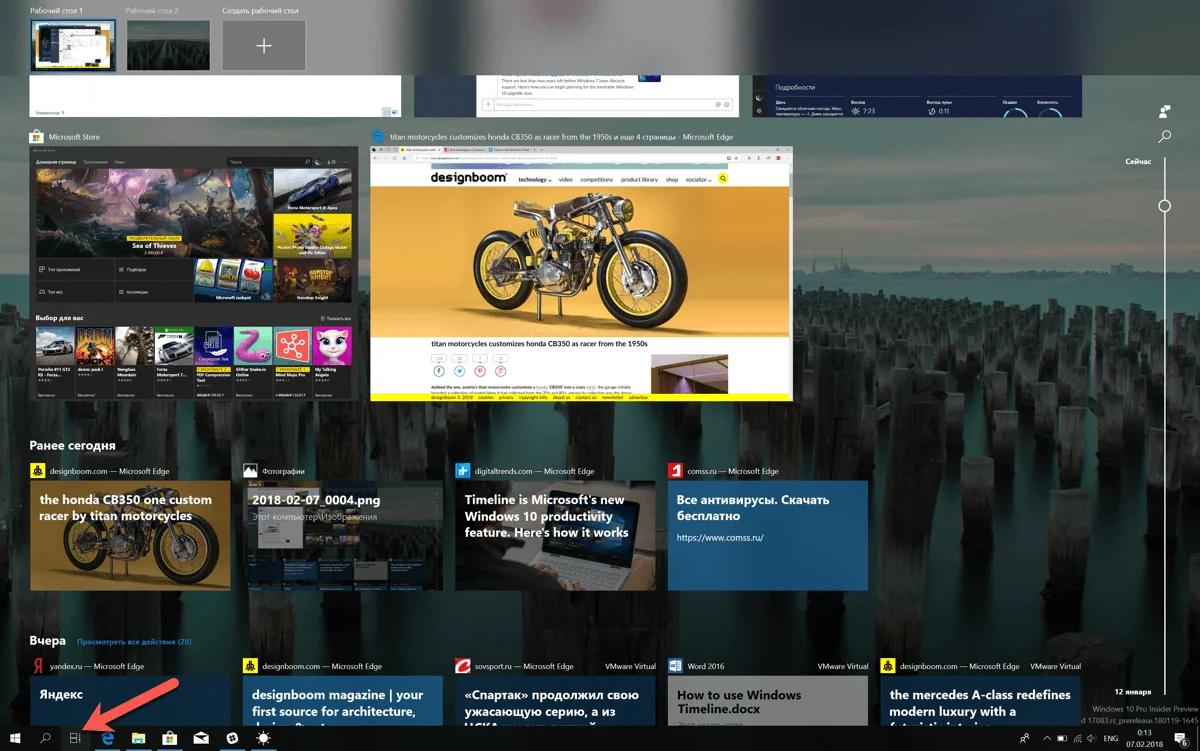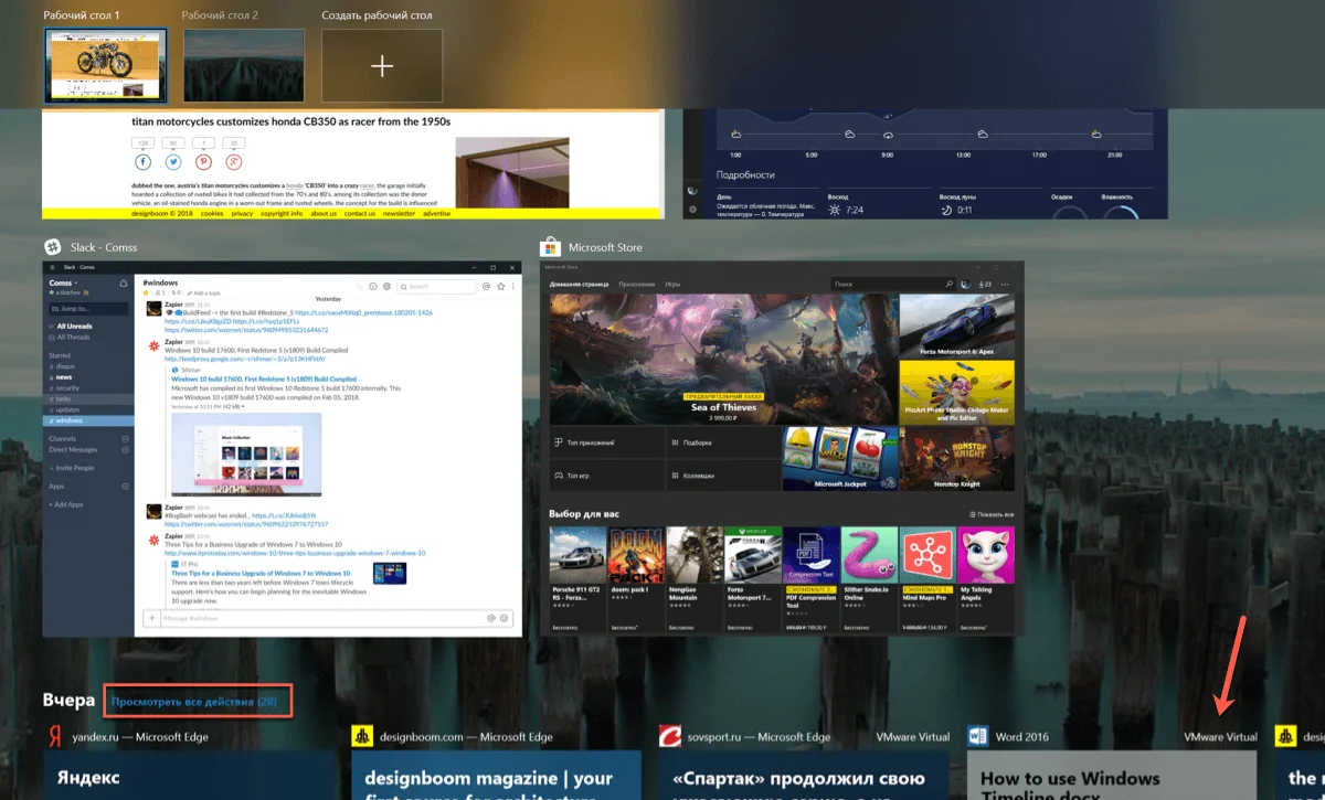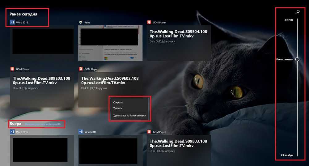 Временная шкала может показывать окна ранее запускаемых приложений, просматриваемых в браузере веб-страниц, документов, изображений, настроек и так далее. С ее помощью вы можете просмотреть, что делали вчера, позавчера, несколько дней, а при условии синхронизации с облаком несколько недель назад, кроме того, инструмент позволяет быстро возобновлять доступ к закрытым задачам.