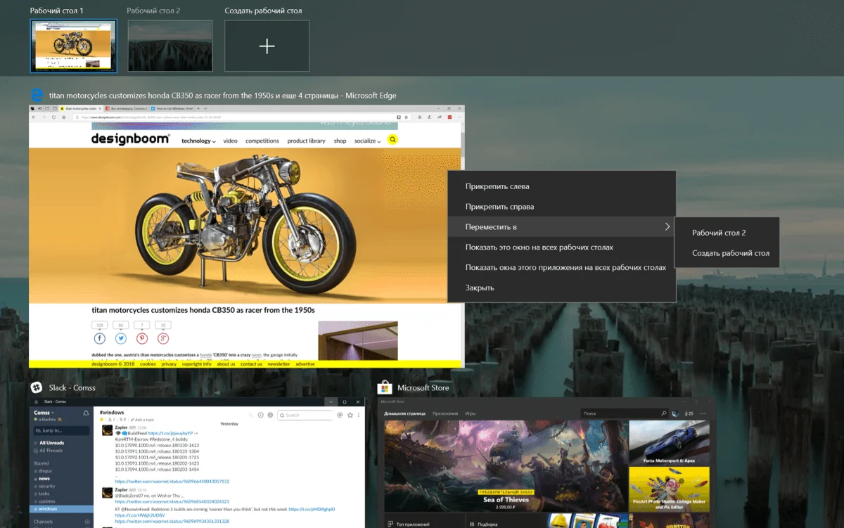 Чтобы получить доступ к действию, просто нажмите его снимок. С помощью контекстного меню вы также можете получить доступ к дополнительным командам для текущих действий, таких как «прикрепить» и переход на другой рабочий стол.