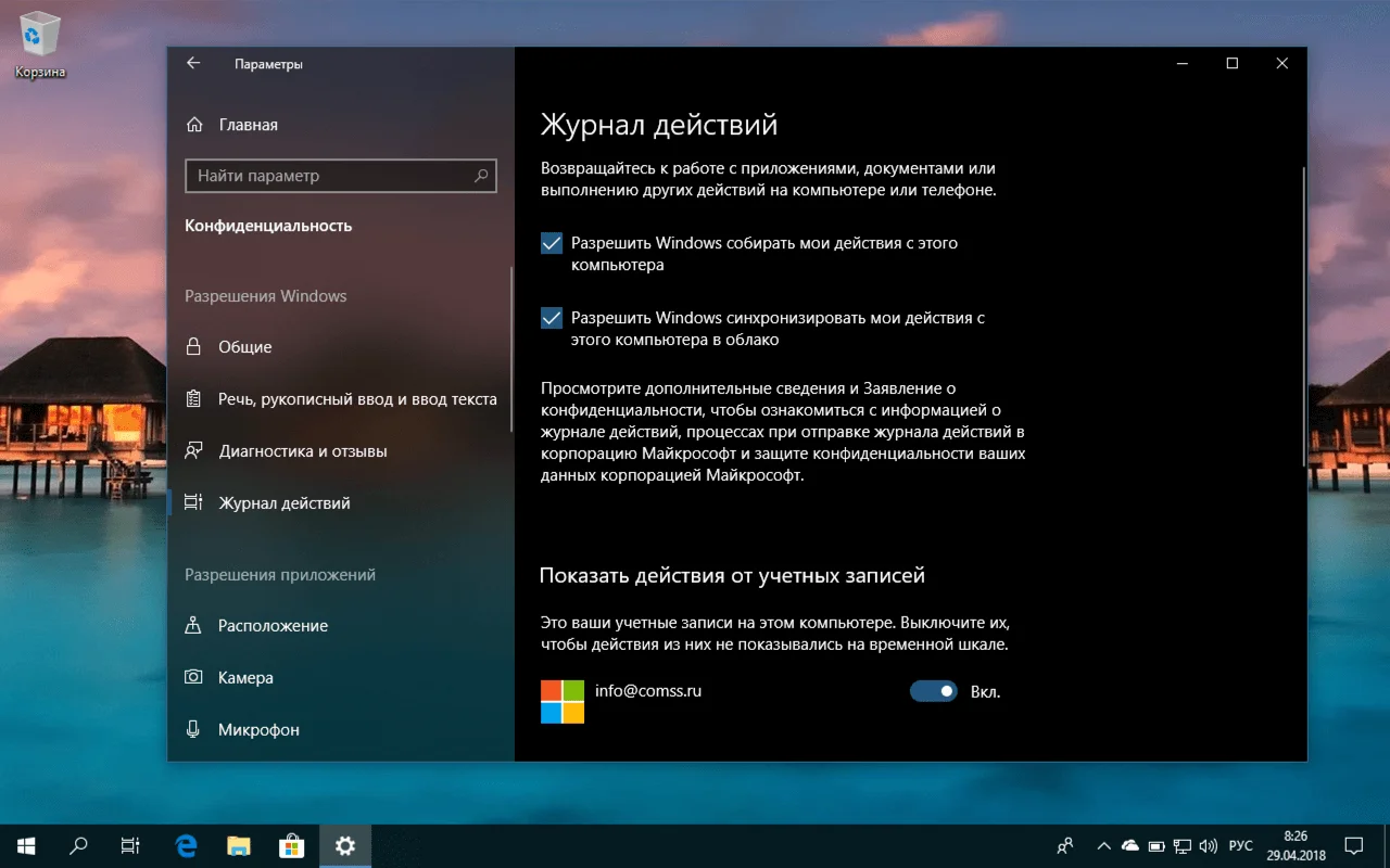 Слева будет несколько вкладок. Необходимо найти «Журнал действий». При нажатии на него справа можно будет увидеть несколько пунктов с галочками около них. Следует отключить функции, связанные с сохранением журнала действий и отправкой их в облако Microsoft.