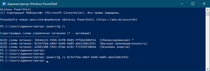 - Чтобы восстановить схему High Performance, используйте команду: exe -duplicatescheme 8c5e7fda-e8bf-4a96-9a85-a6e23a8c635c