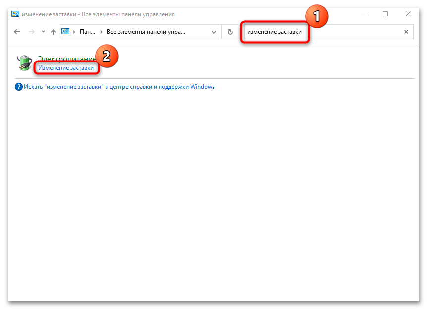 В поисковой строке элементов панели, расположенной в верхнем правом углу, наберите запрос «Изменение заставки». В результате отобразится ссылка для перехода в окно с выбором заставки из раздела «Электропитание». Кликните по ней.