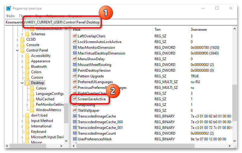 Перейдите по пути через левую панель. В центральном окне найдите параметр с названием «ScreenSaveActive» и дважды щелкните по нему левой кнопкой мыши.