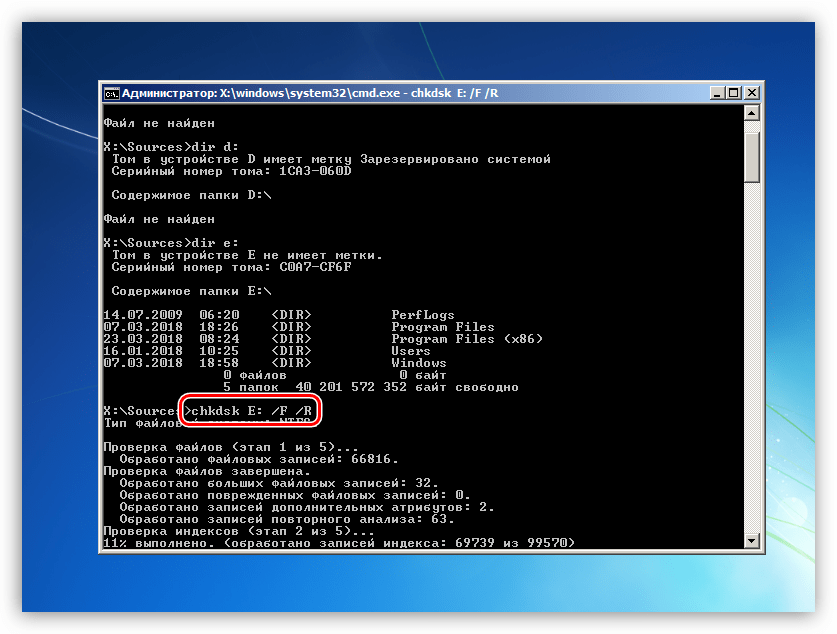 Здесь chkdsk – утилита проверки, E: — буква диска, которую мы определили в пункте 3, /F и /R – параметры, позволяющие восстанавливать поврежденные сектора и исправлять некоторые ошибки.