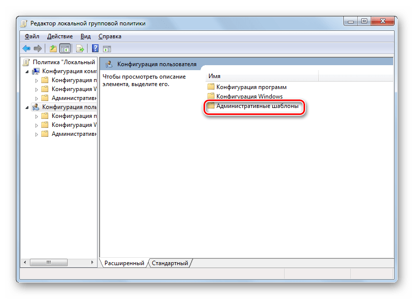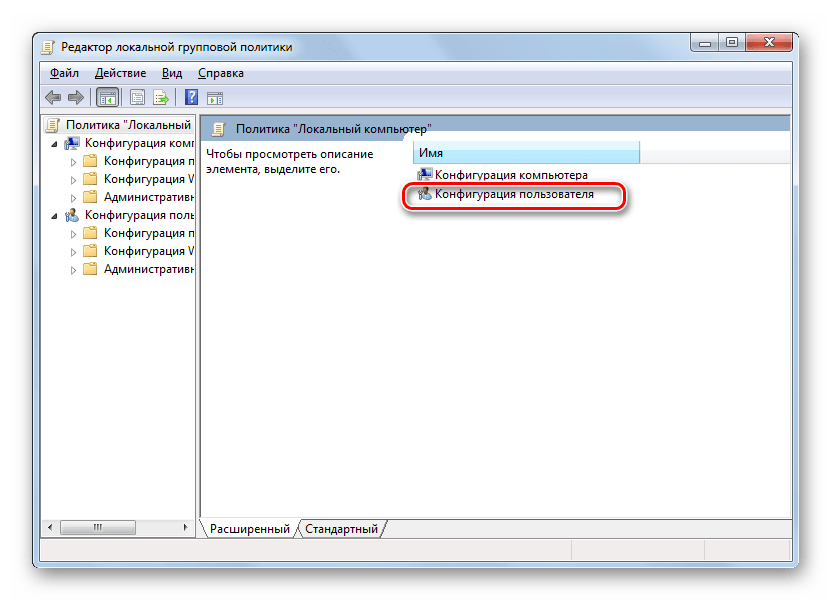 Запускается окно редактора локальной групповой политики. Кликните по наименованию «Конфигурация пользователя».